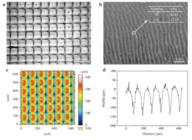 ▲飛秒激光紋理W 的表面形貌:a W 表面和 b 微槽側(cè)壁的 SEM 圖像。c W 表面的 3D 形貌和 d 沿 c 中白線的深度輪廓。